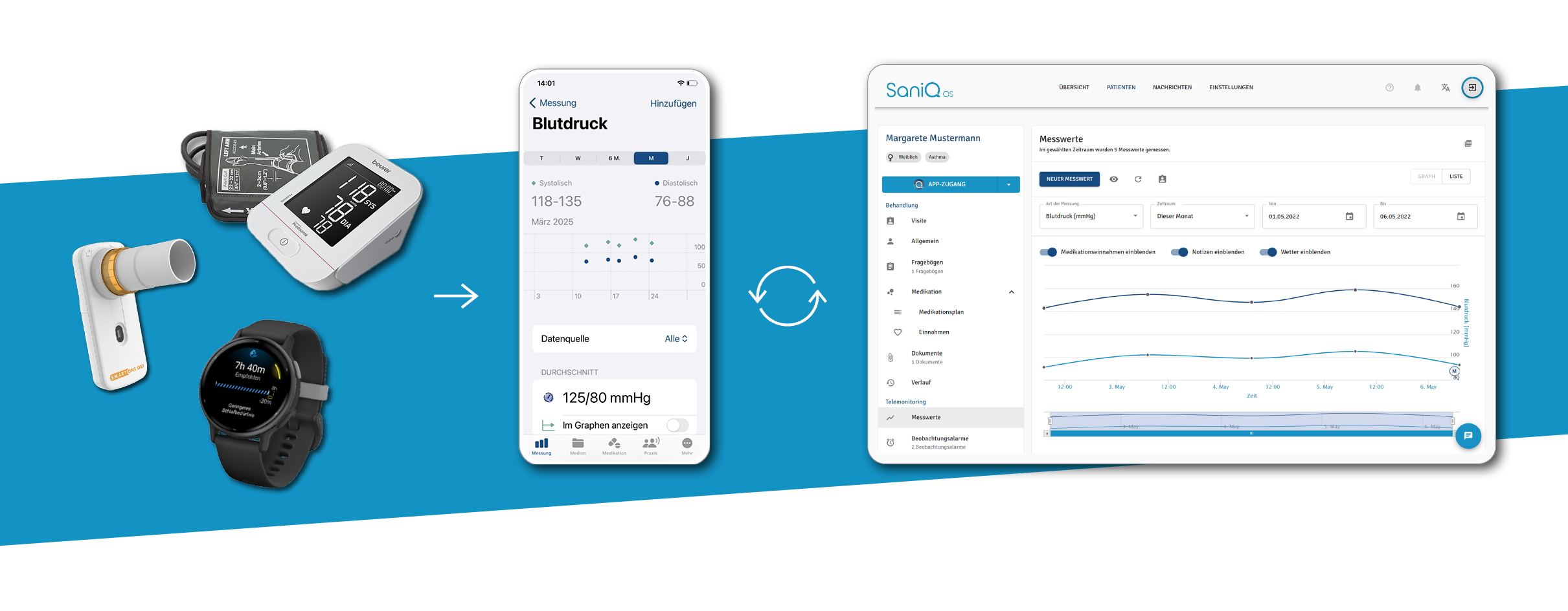 SaniQ OS ist eine telemedizinische Software-Plattform zum Telemonitoring von chronisch kranken Menschen, die Ärzt:innen eine effiziente, personalisierte & digitale Patientenversorgung aus der Ferne ermöglicht.